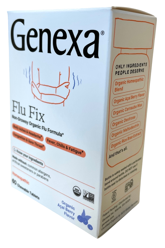 Genexa Flu Fix is a real remedy, made clean - addressing symptoms associated with the flu such as body aches and headache, fever, chills and fatigue, and congestion and sore throat*. Each chewable tablet has the same healing ingredients you need (organic homeopathic blend), but without the artificial ones you don’t (artificial dyes, common allergens, parabens). Founded by two dads on a mission to clean up the medicine aisle, Genexa only uses clean ingredients to make certified organic, gluten-free, non-GMO homeopathic medicines. It’s what people deserve.